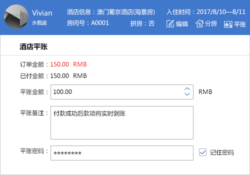 工作人员在进行现场分房的操作时,分房界面会显示每位参会嘉宾的详细入住缴费信息,如果出现未完成预先支付酒店费用的参会嘉宾,系统可以直接进行缴费平账,一键操作,智能快速,也避免了参会嘉宾排队等候的焦躁不安,帮助主办方最大限度的营造一个良好的参会环境,升级用户体验。
