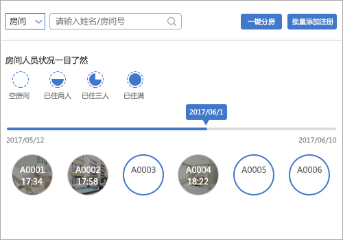 整个分房界面将所有的酒店房型、酒店名称、房间号、已入住人数、房间余量等信息悉数展现,主办方工作人员在操作时即可一目了然。无需多繁复的分房操作,所有的步骤通过简单的点击、拖拽就可以完成分配,另外,高级检索功能支持迅速查找核对参会嘉宾、酒店房间已入住人员等信息,全面把控现场。