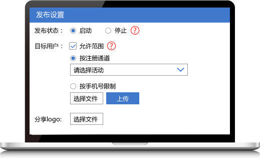 你可以定向选择目标用户进行问卷的发布,可按活动、手机号等条件进行筛选目标群体。如要选择按手机号进行限制时,主办方可以直接上传已筛人员名单,也可下载模板进行重新填写上传即可。分享时还可设置分享logo,给参会人良好的参会体验。
