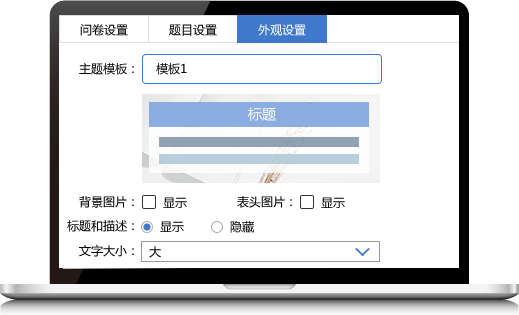 系统已提供四种主题排版风格供参会人在短时间进行问卷制作,除提供的模板外,你还可以自定义上传背景图片让整个问卷展现风格更加鲜明。基本的排版文字大小、标题及描述内容的展现情况均可在外观设置实现。