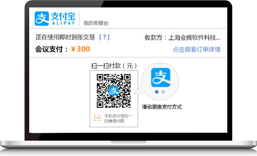 会腾软件票务及支付系统支持线上、线下多渠道付款。线上可以接受支付宝、微信等时下流行的支付方式以及线下参会人直接在会议现场进行刷卡、现金等普通支付,此外还支持信用卡支付项目,全方位适应参会人付费习惯